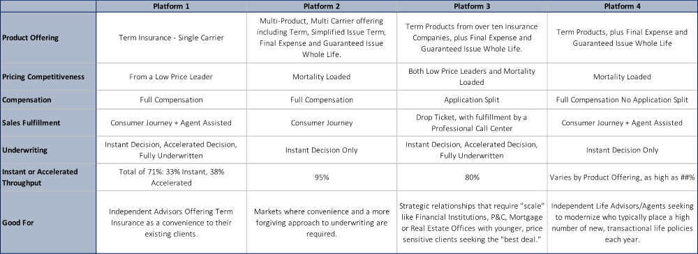 Some of the nuances of available platforms offering a modern, “Click-to-Buy” experience are summarized in Figure 2, below. No two platforms are alike, with each having their own relative strengths. That’s why we’ve spent so much time researching the insurtech providers currently in market. By working with the advisor to develop an intimate understanding of their relative strengths and weaknesses, we’re able to play matchmaker in a way, identifying the best fit for their specific opportunity.
