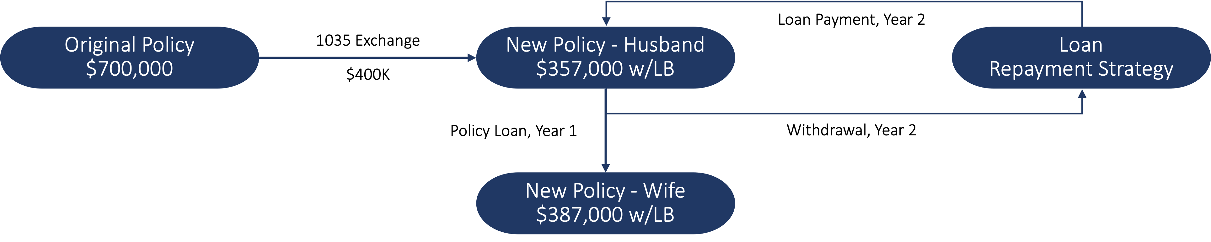 In this case, however, a more effective solution may be available that begins with a 1035 exchange as discussed above, but rather than using other assets to fund a new policy on the wife, the existing cash surrender value on the new policy is used as the source of funds via a policy loan. Figure 1, Funding Two Policies from a Single Exchange, shows the flow of funds, including a critical component: The rapid repayment of the policy loan.